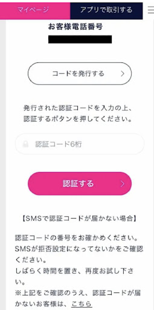 「コードを発行する」をクリックし、登録した電話番号に送られてきた認証コードを入力してください。