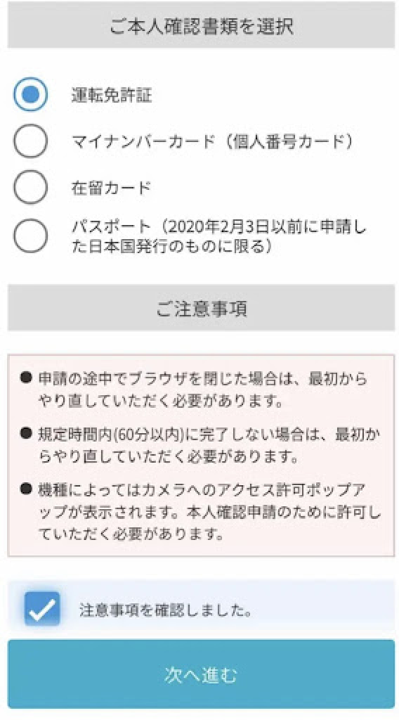 まずは本人確認書類を選択します。本人確認書類は以下の4つから選ぶことができます。